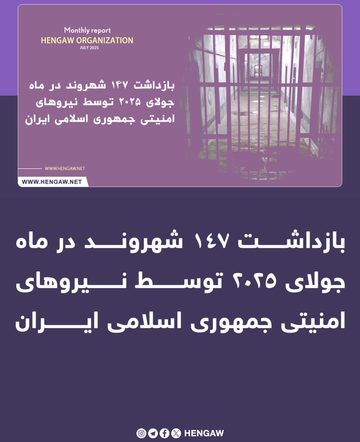 با استناد به آمار به ثبت رسيده در مركز آمار و اسناد سازمان حقوق شرى ههنكاو، طى ماه جولاى ٢٠٢٥ دستكم ١٤٧ شهروند كه هويت كامل أنها احراز شده است در كل ايران توسط نيروهاى امنيتى بازداشت شدهاند. اين آمار نسبت به مدت مشابه سال كذشته هه مورد معادل ٠ع٪ افزايش داشته است. در ماه جولاى ٢٠٢٢ دست كم ٩٢ شهروند بازداشت شده بودند.